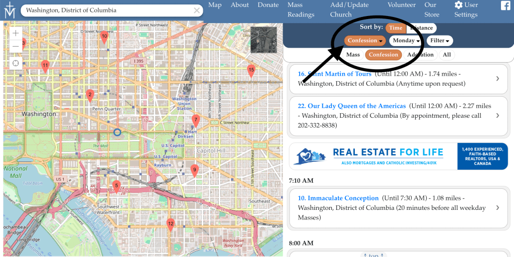 Masstimes.org is a great resource to find a church near you. Once you input your zip code, you can search for churches that offer confession in your area (you can adjust this setting on the top right side; see screenshot below).